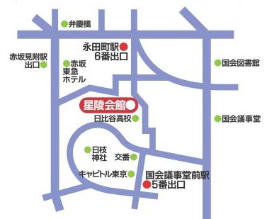 | 場所 | 星陵会館ホール 千代田区永田町2-16-2 TEL03-3581-5650 最寄駅:東京メトロ有楽町線・南北線・半蔵門線 永田町 6番出口 徒歩3分 |