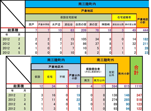 下の一覧表は、コミュニティスペースへのニーズがとりわけ高かった初期のご利用者数を仮設地区別・在宅別などに集計したものです。(集計:ラムズ)