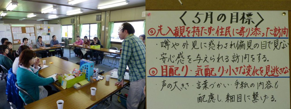 支援員さんは、自らが被災者でありながらも、現地住民の方々の安全安心の確保と、復興への意欲醸成を図るために、志願して仮設住宅や在宅避難者のお宅を回っておられます。