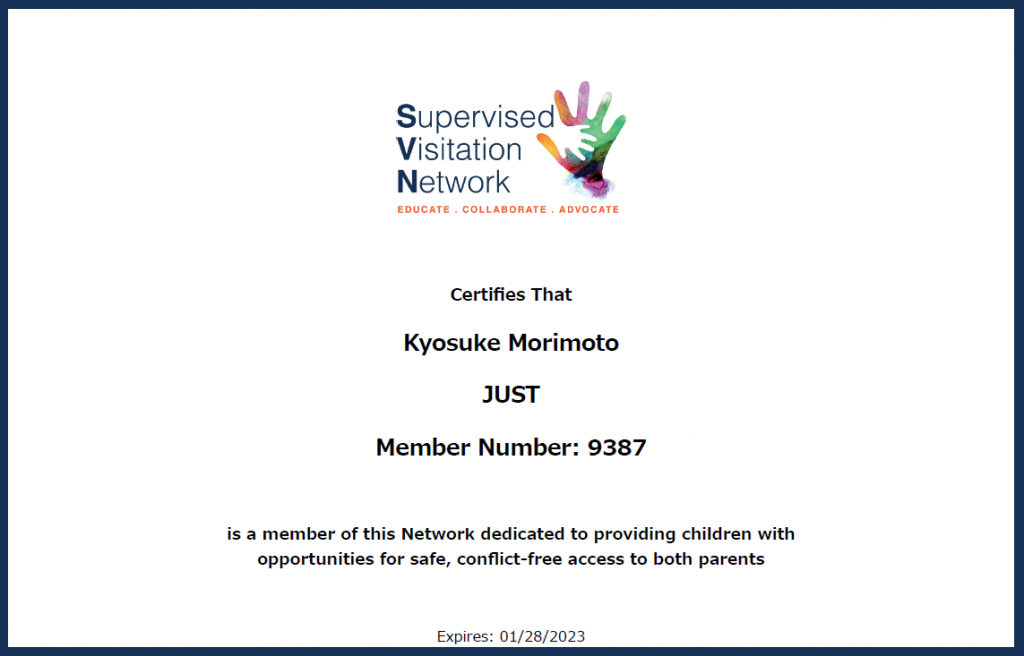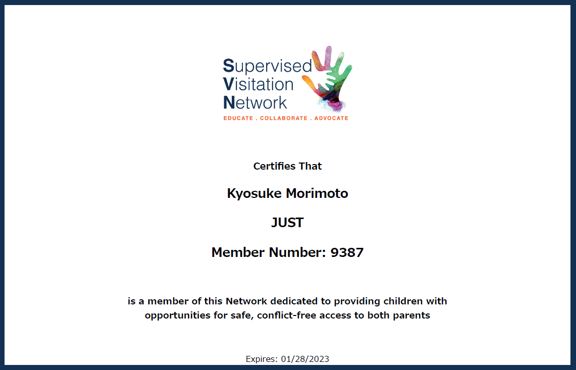 私たちは、米国Supervised Visitation Network (SVN)のメンバーです。日本の文化や制度に合わせて一部カスタマイズをする以外は、SVNの提唱する理念や手法を基盤としてサービスを提供します。SVNは米国で1992年に設立され、2018年末時点で800以上の支援者が加盟する、世界最大規模の面会交流支援者ネットワークです。
